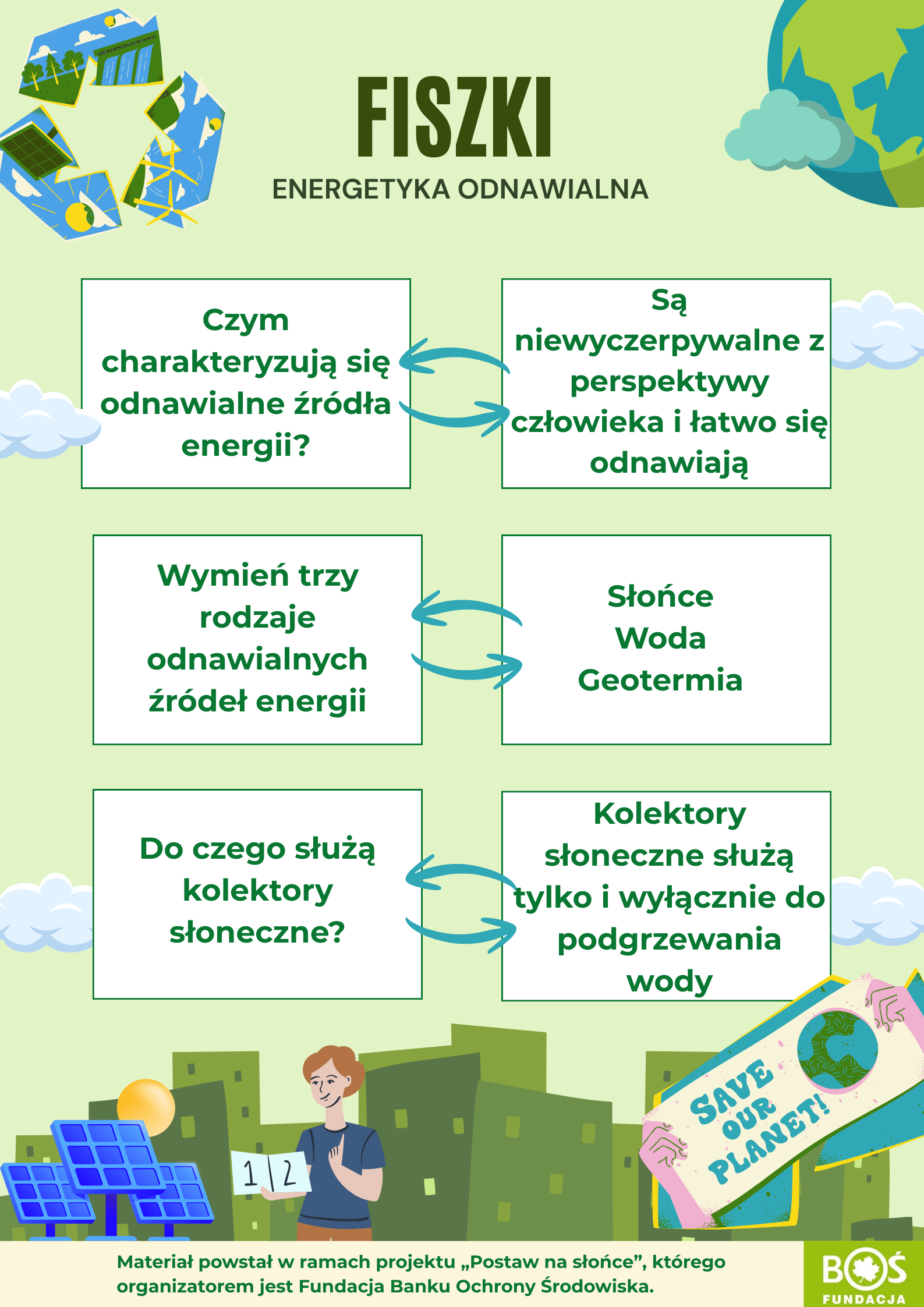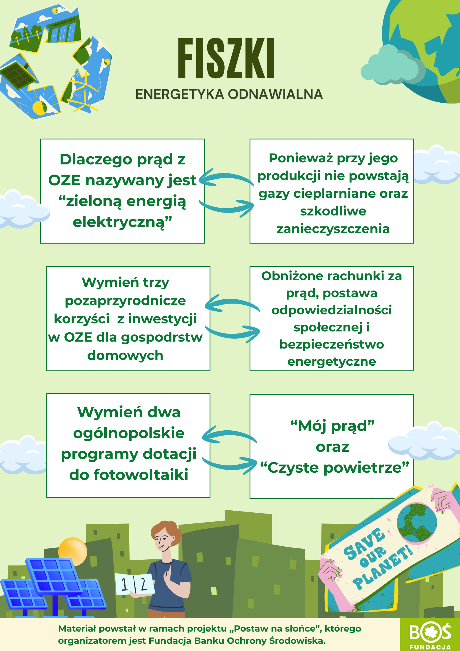 Ferie zimowe już za nami! A my nadal na pełnych obrotach! Nasza drużyna biorąca udział w Projekcie Edukacyjnym „Postaw na Słońce” ani na chwilę nie zwolniła tempa. W ramach działań projektowych uczniowie przygotowali „Fiszki – podstawy OZE”– krótkie, przejrzyste i przyjemne w formie materiały, które w prosty sposób przybliżają temat odnawialnych źródeł energii. To świetny przykład na to, że nauka może być ciekawa, nowoczesna i ekologiczna